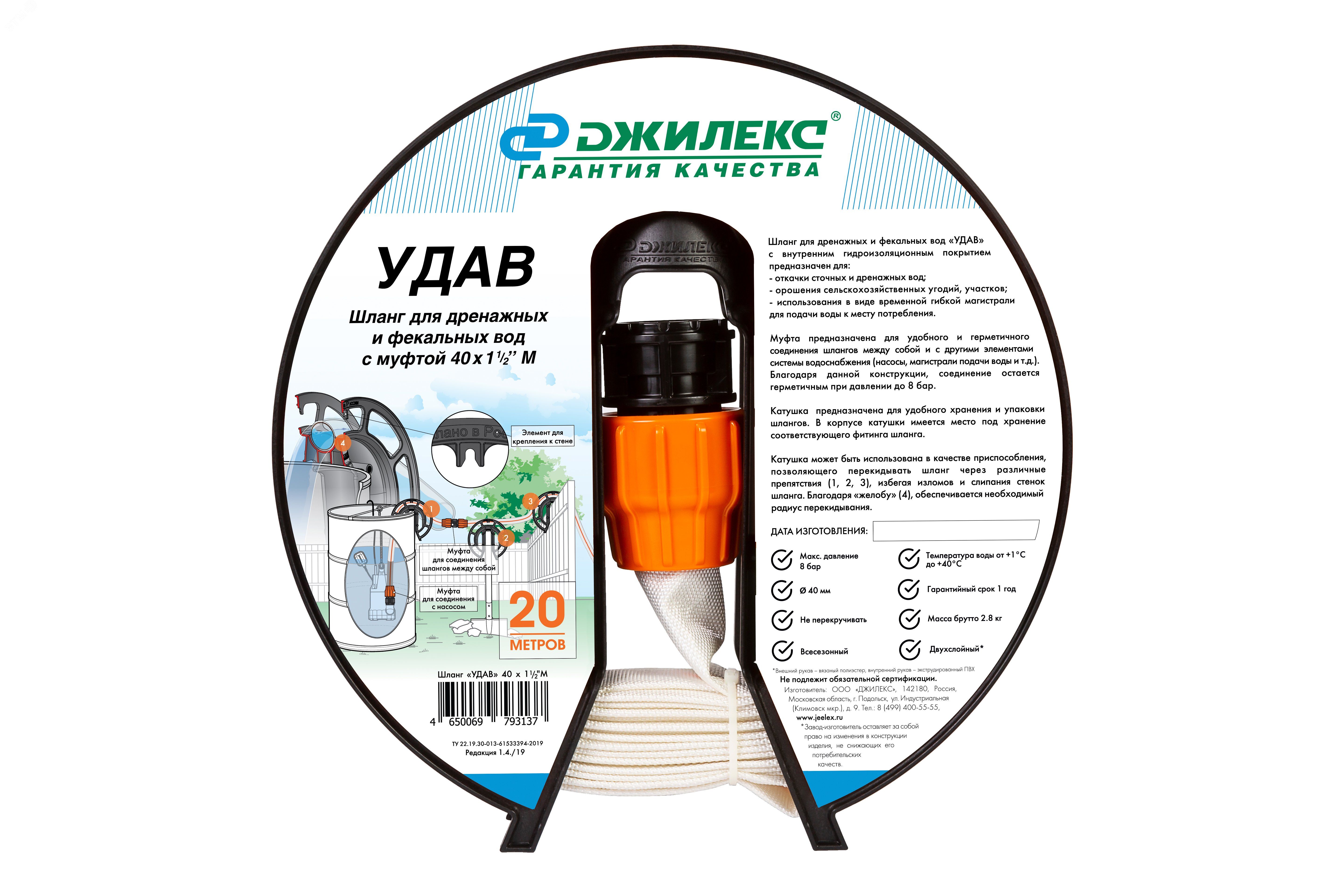Шланг УДАВ 40мм с фитингом 1 1/2'М, бухта 20м - 9111 ДЖИЛЕКС имеет диаметр 40 мм и длину бухты 20 м. Гарантийный срок составляет 12 месяцев, что гарантирует надежность и долговечность данного изделия.