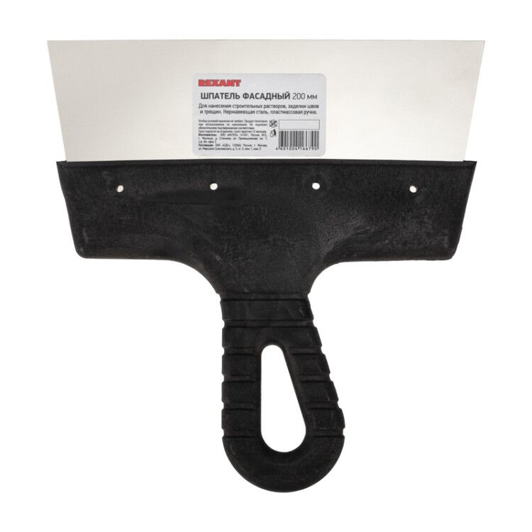 Шпатель фасадный 200 мм нержавеющая сталь, пластмассовая ручка от Rexant (артикул 89-0206) - инструмент для нанесения и выравнивания строительных смесей на вертикальных и горизонтальных поверхностях, особенно эффективен при работе с штукатуркой и шпатлёвкой на фасадах и внутри зданий.