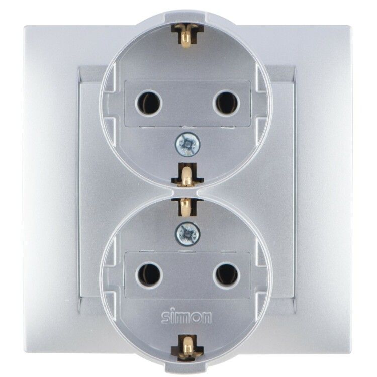 Розетка двойная 2P+E Schuko, 16А, 250В, винтовой зажим, алюминий от бренда Simon (артикул 1590459-033) предназначена для безопасного подключения двух бытовых устройств с заземлением через винтовые клеммы. Подходит для скрытой установки в стены из бетона или кирпича.