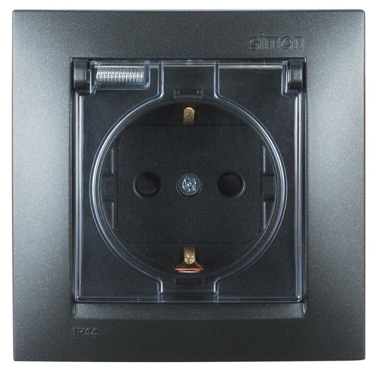 Розетка с заземлением и шторками Schuko 16А 250В IP44 с крышкой, моноблок, графит от бренда Simon, артикул 1590450-038, предназначена для безопасного подключения бытовых приборов в условиях повышенной влажности или запыленности. Моноблок с защитными шторками и крышкой обеспечивает надежную изоляцию даже при случайном контакте.