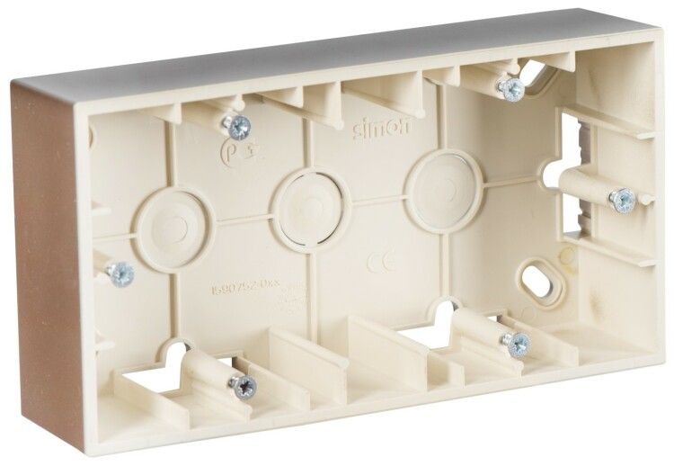 Коробка совместима с любыми двухпостовыми лицевыми рамками и механизмами, соответствующими стандарту Европа (например, серия Simon 80/81). Для монтажа используйте саморезы (не входят в комплект) через отверстия на задней стенке. Кабели заводятся через четыре задних ввода - можно использовать кабельные вводы или просто продеть провода, фиксируя их после установки механизмов. Убедитесь, что толщина стены и тип покрытия (штукатурка, ГКЛ, дерево) позволяют надёжно закрепить коробку.