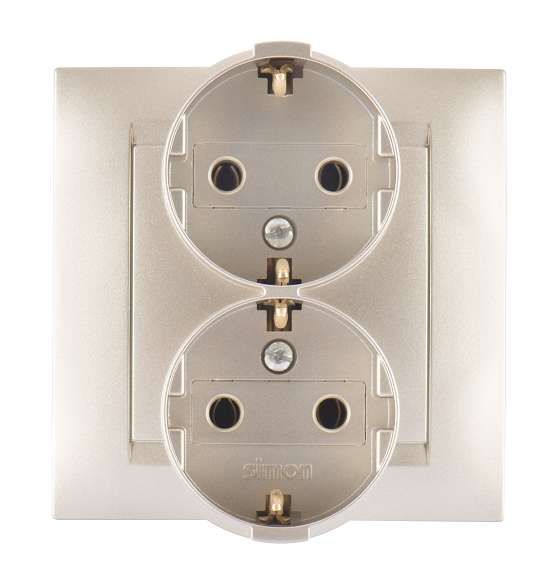 Розетка двойная скрытая с заземлением 2х2Р+Е 16А 250В винтовые зажимы шампань стандарта SCHUKO от бренда Simon (артикул 1590459-034) предназначена для безопасного подключения двух бытовых устройств с заземлением в помещениях с нормальной влажностью. Конструкция соответствует европейскому стандарту SCHUKO и обеспечивает надёжное соединение через винтовые клеммы.