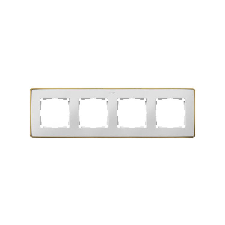 Рамка декоративная 4 поста, белый-золото от Simon (арт. 8201640-245) предназначена для эстетичного оформления установочных коробок с четырьмя модулями - выключателями, розетками или другими элементами управления. Изготовлена из термопластика без галогенов, обеспечивает надежную фиксацию без винтов и подходит для внутренней установки в помещениях с умеренным климатом.