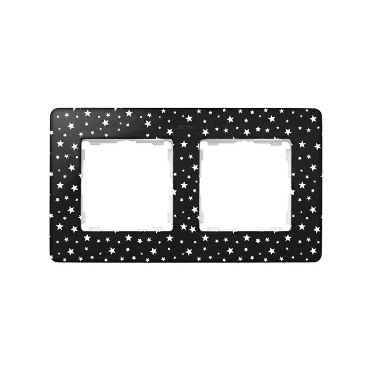 Рамка декоративная 2-постовая Simon 8200620-222 предназначена для маскировки монтажной коробки и оформления выключателей или розеток в интерьере. Её уникальный дизайн с белыми звёздами на чёрном фоне сочетает функциональность и эстетику, подходящую для современных интерьеров.
