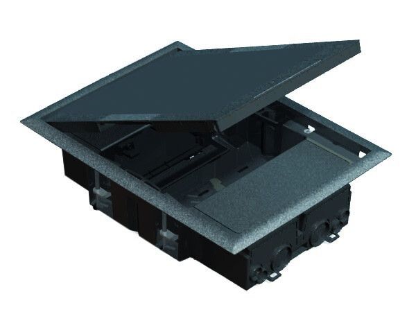 Люк на 2 модула (CIMA, S) горизонтального подключения, глубина 69мм, посадка 250х178мм, серый предназначен для скрытой установки в напольные покрытия, где требуется доступ к коммуникациям - силовым кабелям, сетям связи, контроллерам или другим устройствам, установленным в двух монтажных коробках. Обеспечивает безопасный и эстетичный способ маскировки точек подключения в зонах с высокой проходимостью.