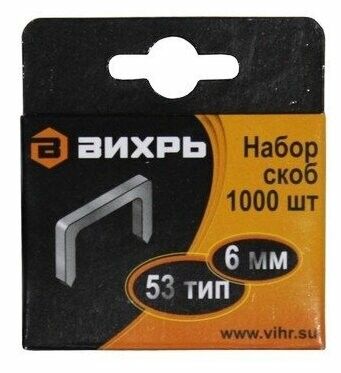 - Скобы 6 мм тип 53 (1000 шт) от Вихрь лучше всего сочетаются с одноимёнными степлерами - гарантируется точная подгонка