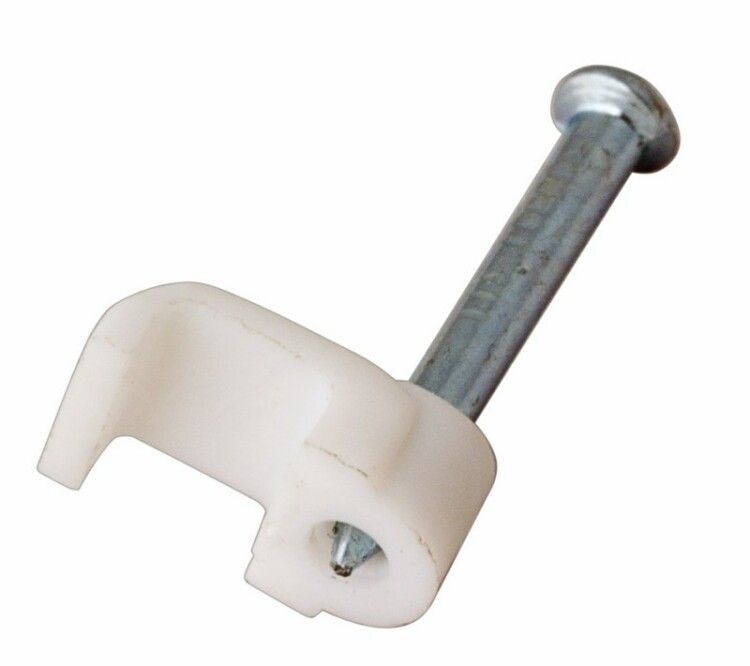 Крепеж кабеля плоский 12х6 мм, белый (упаковка 50 шт) совместим только с плоскими кабелями, не подходящими для круглых проводов. Монтаж выполняется вручную: достаточно приложить скобу к поверхности и забить гвоздь молотком. Гвоздь уже установлен - не требует самостоятельной установки. Подходит для дерева любой плотности, включая твёрдые породы. Не рекомендуется использовать на металле, бетоне или камне - гвоздь не войдёт, скоба не зафиксируется.