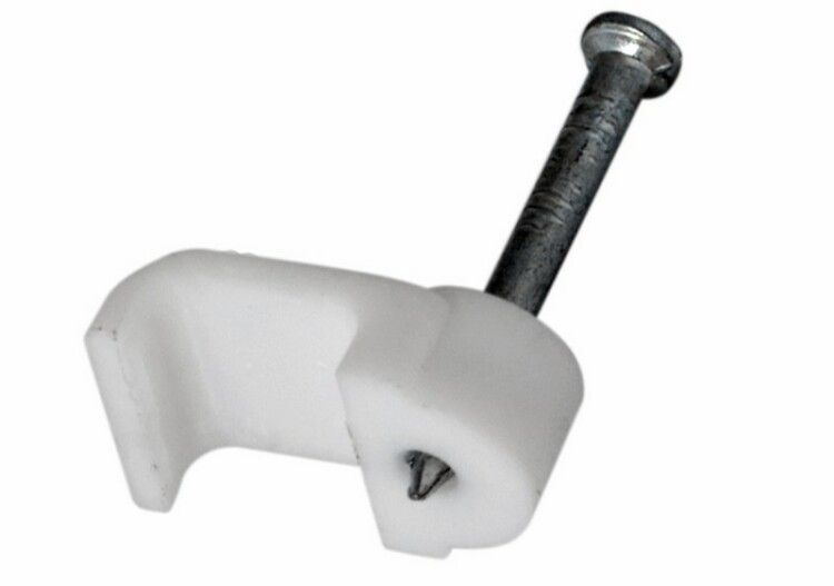 Крепеж кабеля плоский 8х3 мм, белый (упаковка 50 шт) совместим только с плоскими кабелями, имеющими точный профиль 8×3 мм. Круглые кабели или жилы большего сечения не поместятся. Монтаж выполняется вручную: гвоздь забивается молотком напрямую через отверстие в скобе. Установка возможна только на деревянные основания - бревна, доски, фанера, OSB. На бетон, металл или гипсокартон этот крепеж использовать нельзя.