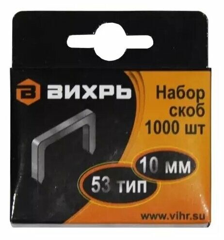 Скоба для мебельного степлера 10 мм тип 53 (1000 шт) от бренда Вихрь - это надёжный крепёж для фиксации тканей, обивки и плёнок к деревянным, пластиковым и фанерным основаниям. Комплект из 1000 скоб рассчитан на длительную работу с мебельными степлерами, обеспечивает устойчивую фиксацию даже при высокой нагрузке.