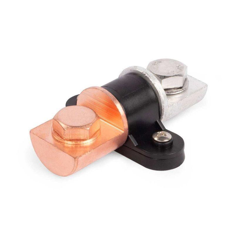 Алюмомедный соединитель АМК-30 совместим с медными и алюминиевыми наконечниками, опрессованными на кабелях соответствующего сечения. Для установки требуется только затянуть болт М10 моментом, достаточным для плотного контакта - перетягивать не следует. Пластиковая скоба фиксирует шину в нужном положении и защищает от случайного смещения. Установка выполняется без инструментов, кроме гаечного ключа на 17 мм.
