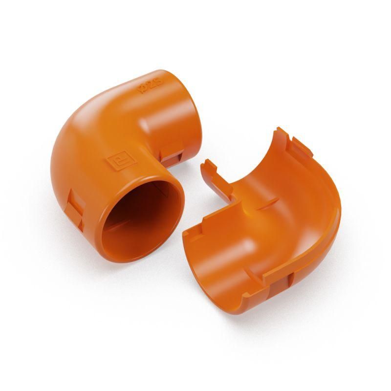 Соединитель угловой разборный оранжевый d25 мм от ПРОМРУКАВ (арт. pr13.1207) предназначен для создания поворотов в системах защиты проводов и кабелей, особенно там, где важна эстетика и возможность монтажа на готовую трассу.