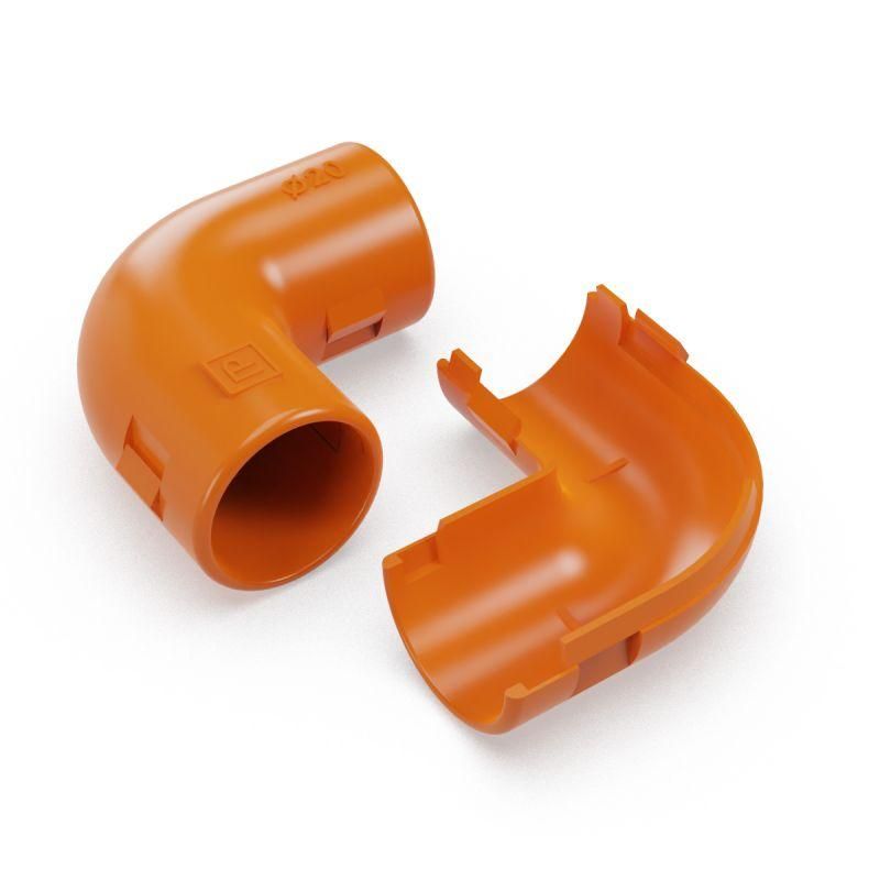 Соединитель угловой разборный оранжевый d20 мм используется для изменения направления кабельной трассы под углом 90°. Подходит для прокладки проводов и кабелей в помещениях, где важна аккуратность и безопасность - например, в цехах, на производстве, в системах автоматизации. Особенно удобен там, где требуется модернизация существующих трасс без демонтажа.