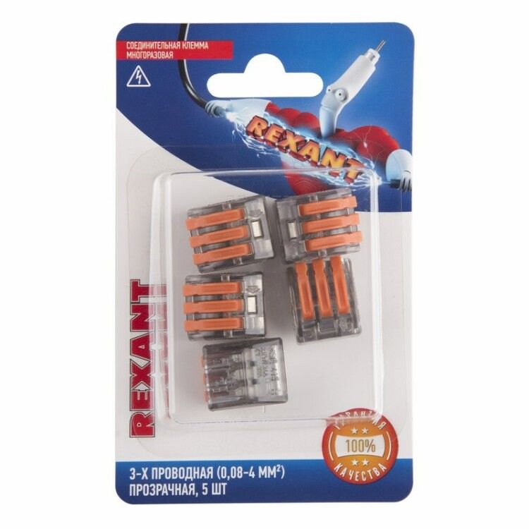 Соединительная клемма многоразовая, 3-х проводная, прозрачная (0,08-4 мм ), (5шт.) | 06-0204-B5 REXANT - это надежное и удобное устройство для подсоединения проводов. Благодаря своей конструкции с плоско-пружинным зажимом, она обеспечивает надежный контакт и стабильное соединение. Она идеально подходит для использования с медными одножильными и многожильными проводами тонкого сечения.