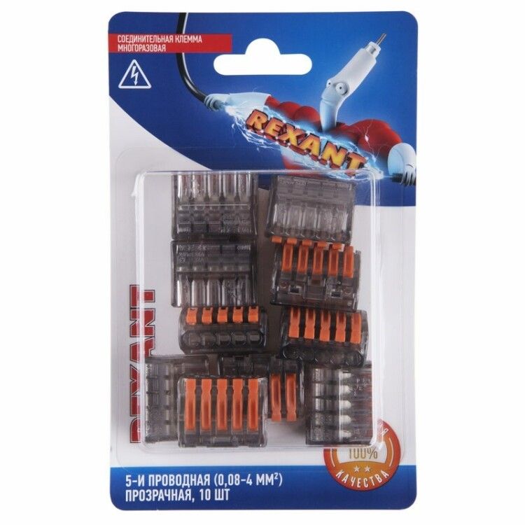 Клемма соединительная многоразовая 5-проводная прозрачная 0,08–4 мм2 (10 шт) от Rexant - надёжное решение для временного или постоянного соединения до пяти проводников малого сечения. Артикул 06-0205-c10 подходит для слаботочных цепей, автоматизации и сборки электрооборудования.