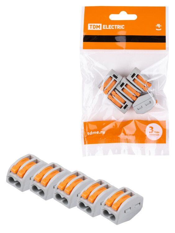 Соединительная клемма СК-412 (2,5 мм2) (5 штук в упаковке) от TDM ELECTRIC - компактный и надёжный элемент для быстрого соединения одножильных и многожильных медных проводов в распределительных коробках и других точках ответвления. Каждая клемма рассчитана на два проводника, имеет рычажковый механизм и поддерживает работу в сетях до 80 В.