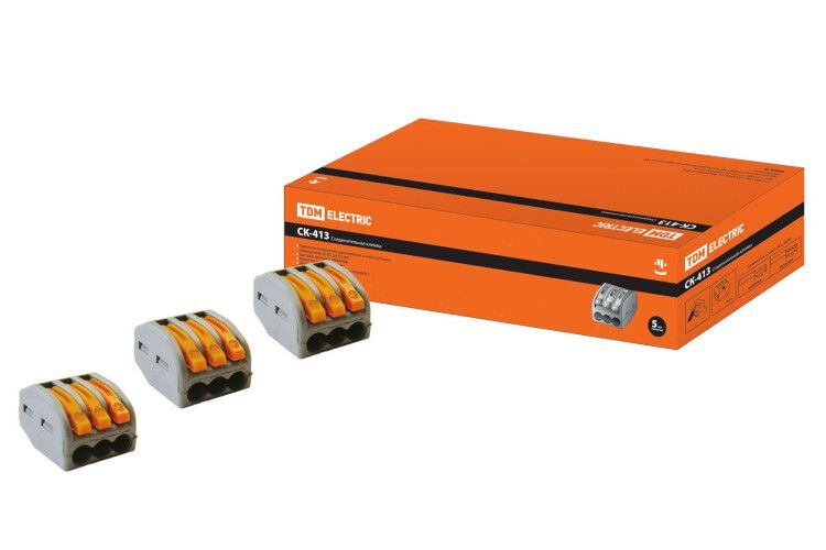Соединительная клемма СК-413 (2,5 кв. мм) от TDM ELECTRIC - компактный устройство для надёжного и быстрого соединения одножильных и многожильных медных проводов в распределительных коробках, при подключении освещения и слаботочного оборудования. Клемма рассчитана на работу в сетях до 80 В, имеет три зажима и удобный рычаг для фиксации.