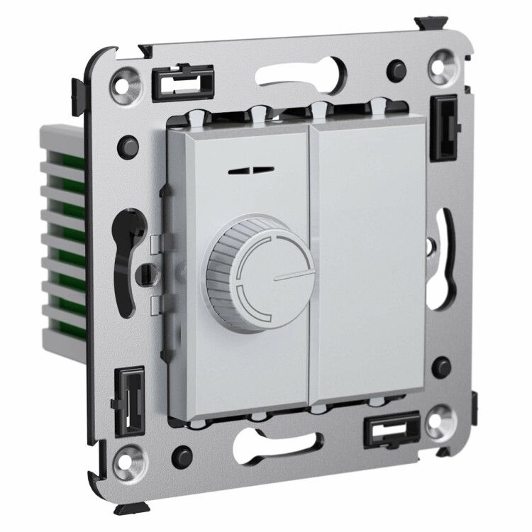Диммер поворотный в стену, закаленная сталь совместим с любыми подрозетниками глубиной не менее 45 мм (например, код 59301). Монтаж выполняется в соответствии с правилами электромонтажа: