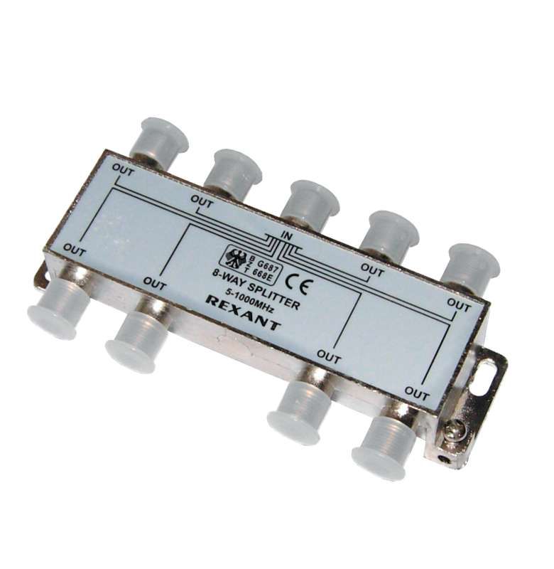 Делитель телевизионный х8 под F разъем 5-1000 МГц от REXANT - устройство для равномерного распределения TV-сигнала от одного источника на восемь приемников. Подходит для установки в жилых и офисных помещениях, где необходимо подключить несколько телевизоров к одному антенному кабелю.