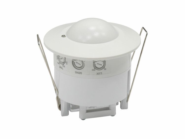 Датчик движения микроволновый MS780 предназначен для скрытой установки в потолочные ниши или короба. Монтаж выполняется на потолке - рекомендуемая высота 2,5 м для максимальной точности обнаружения. Кабель подключается напрямую к фазе и нулю: вход - питание, выход - нагрузка (например, люстра или группа светильников). Нагрузка должна соответствовать допустимому току устройства - максимум 2,5 мм2 провода. Для регулировки чувствительности есть поворотный механизм на корпусе - позволяет снижать уровень реакции на мелкие движения (животные, вибрации).