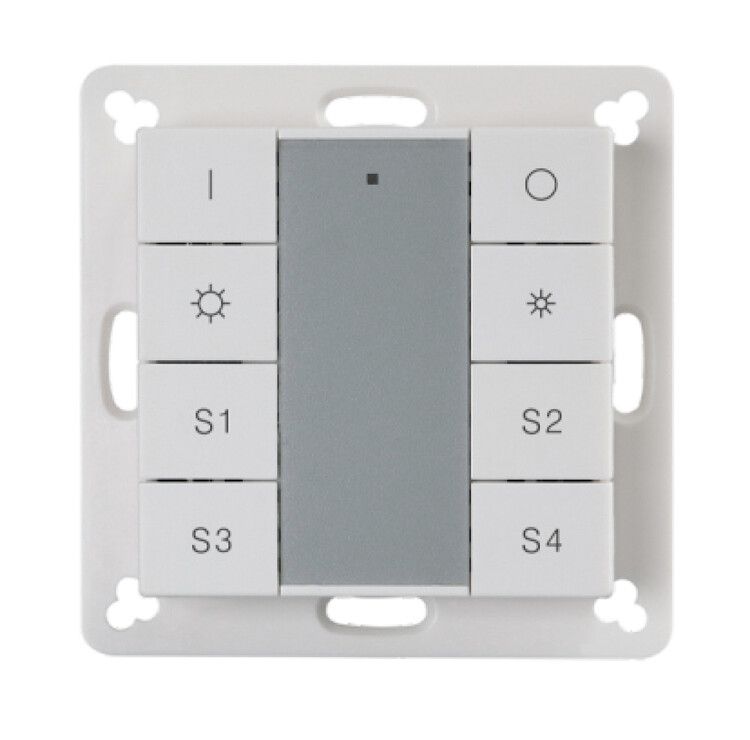 - Восьмикнопочная компоновка позволяет управлять четырьмя группами светильников с функциями включения/выключения и диммирования - оптимально для зонированного освещения