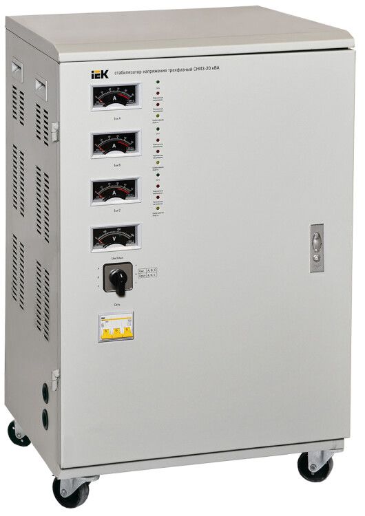 Стабилизатор напряжения трехфазный 20 кВА СНИ3-20 - IVS10-3-20000 IEK (ИЭК) - это электромеханический стабилизатор напряжения, предназначенный для поддержания стабильного однофазного/трехфазного напряжения питания нагрузок бытового и промышленного назначения 220 B/3x220 В, 50 Гц при отклонениях сетевого напряжения в широких пределах по значению и длительности.
