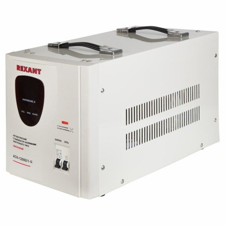 Стабилизатор напряжения АСН-12000/1-Ц от REXANT - однофазный релейный прибор для защиты оборудования от колебаний сетевого напряжения. Он обеспечивает стабильное 220 В на выходе при входном напряжении от 140 до 260 В, подходит для дома и производства, рассчитан на нагрузку до 12 кВА.