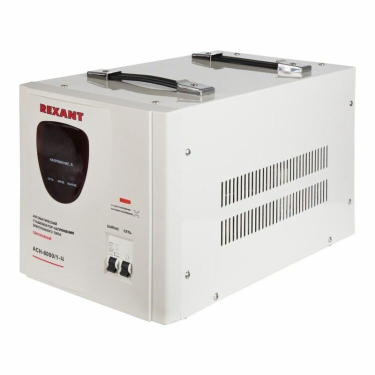 Стабилизатор напряжения АСН-8000/1-Ц от REXANT - однофазный релейный прибор для защиты оборудования от колебаний сетевого напряжения. Устройство обеспечивает стабильное 220 В на выходе при входном напряжении от 140 до 260 В, подходит для домашних и промышленных применений. Артикул 11-5006.