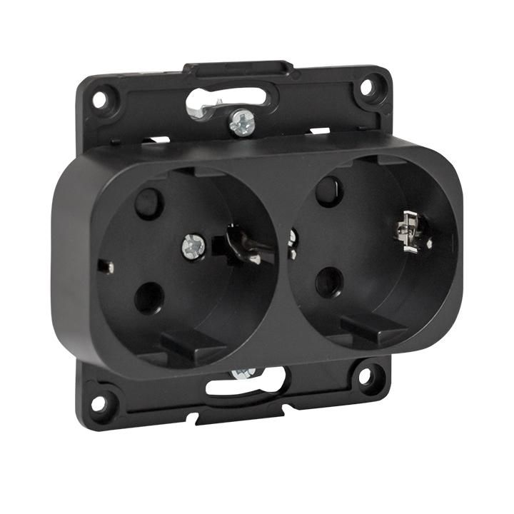 Розетка 2-местная с заземлением, защитными шторками, 16А, черная, механизм, серия Стокгольм не предназначена для работы во влажных средах - IP20 не защищает от брызг и пара. Не рекомендуется устанавливать вблизи раковин, душевых, кухонных плит. Также не следует использовать для подключения оборудования с током выше 16 А - например, мощных электрокотлов или сплит-систем. Механизм работает только с рамками серии Стокгольм; другие модели не подойдут по форме и креплению.