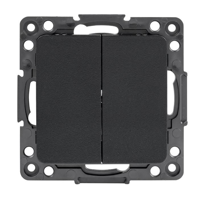 Выключатель проходной 2-клавишный 10А винтовые клеммы черный требует парного использования с таким же устройством в другой точке. Для работы необходим третий провод - перемычка между двумя выключателями (обычно «перекидной» провод). Клеммы винтовые - обеспечивают надёжный контакт даже с многожильными проводами, но требуют затяжки отверткой. Не используйте самозажимные клеммы - здесь они не предусмотрены.
