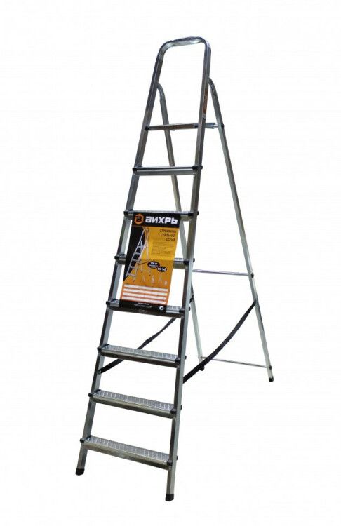 Стремянка стальная СС 1х8 от бренда ВИХРЬ - надёжная односторонняя лестница из стали с рабочей высотой 3,69 м, предназначенная для выполнения работ на средней высоте в условиях производства, обслуживания и дома. Артикул 73/5/1/12 соответствует устойчивой конструкции с восемью ступенями и антивандальным покрытием.