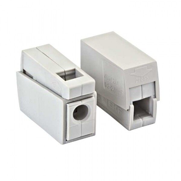 Строительно-монтажная клемма СМК 224-111 совместима с одножильными проводами из меди и алюминия, а также с многожильными медными проводами, имеющими опрессованные наконечники. Монтаж выполняется просто: зачищенный провод вставляется в один из двух зажимов до упора - пружинный механизм сам фиксирует проводник. Для демонтажа достаточно нажать на рычажок и вытянуть провод. Обжимной тип обеспечивает плотный контакт без необходимости затяжки винтов, снижая риск перегрева и ослабления соединения.
