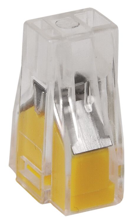 Строительно-монтажная клемма СМК 773-322 желтая совместима с одножильными и многожильными проводниками, включая особо тонкопроволочные гибкие провода без наконечников. Монтаж выполняется на кабель: зачищенный провод вставляется в зажим до упора, после чего пружинный механизм автоматически фиксирует его. Для освобождения провода достаточно нажать на рычаг зажима. Клемма не требует затяжки винтов - снижает риск перегрева и плохого контакта.