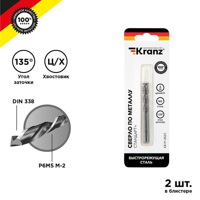 Сверло по металлу 3мм "Стандарт+" (P6M5 M-2) DIN 338 (блист.2шт) Kranz KR-91-0523