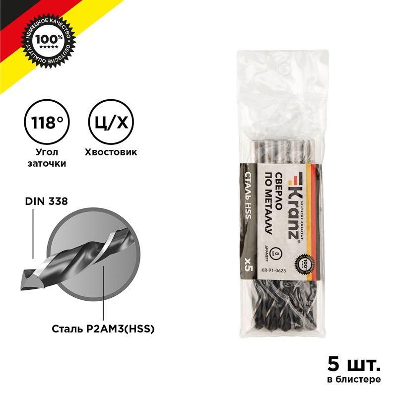Сверло по металлу 8,0 мм HSS DIN 338 (5 шт. в упаковке) от бренда Kranz - универсальный инструмент для сверления отверстий в металле, дереве и пластике. Подходит для работы с дрелями, шуруповёртами и станками, использует цилиндрический зажим и изготовлена из прочной быстрорежущей стали HSS.