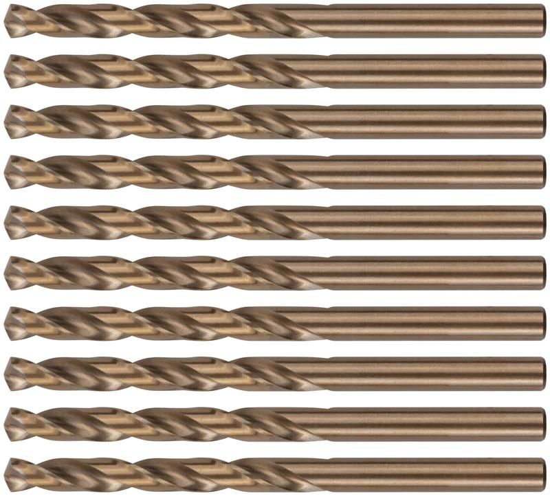 Это сверло идеально подходит для сверления отверстий в углеродистых и легированных сталях, серых и ковких чугунах, цветных металлах и пластике. Упаковка включает 10 штук сверл, которые удобно хранить в подвесном пластиковом боксе.