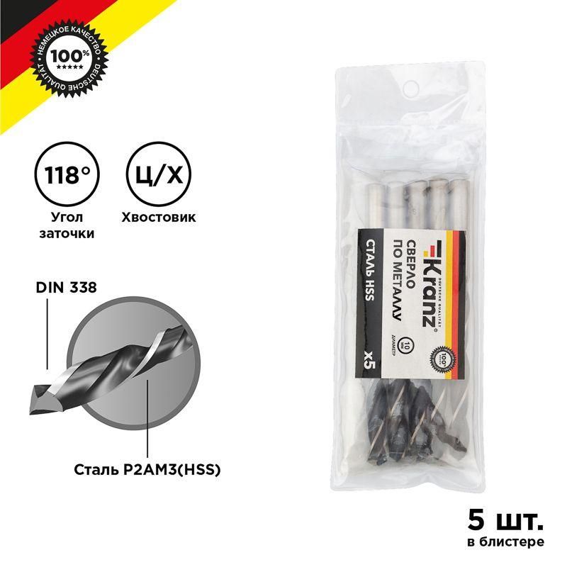Сверло по металлу 10,0 мм HSS DIN 338 (5 штук в упаковке) от бренда Kranz - надёжная оснастка для сверления отверстий в металле, дереве и пластике. Подходит для работы с дрелями, шуруповёртами и станками, использует цилиндрический зажим и изготовлена из быстрорежущей стали HSS по стандарту DIN 338.
