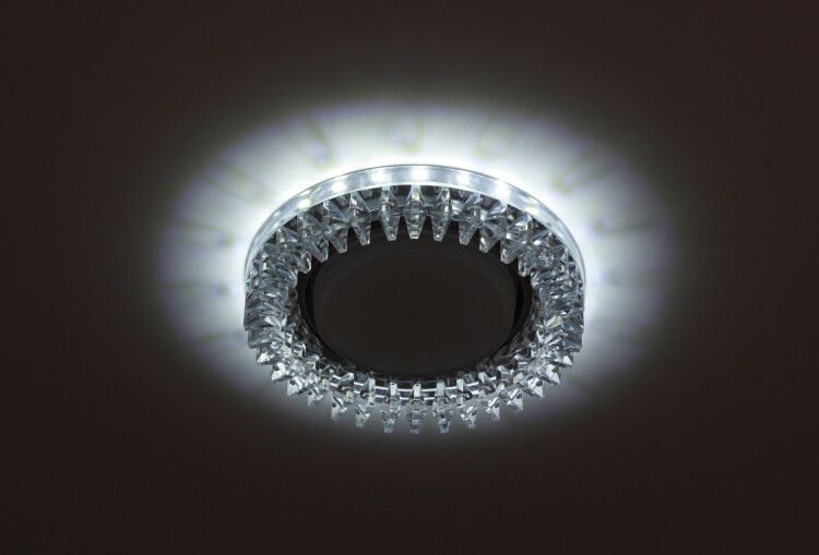 Светильник точечный встраиваемый декоративный с подсветкой, прозрачный, лампа GX53, 15 Вт устанавливается в подготовленное отверстие диаметром 90 мм. Для фиксации используются пружинные зажимы, входящие в комплект. Общая ширина устройства - 125 мм, поэтому необходимо убедиться, что материал потолка или стены позволяет безопасно вырезать такое отверстие. Лампа GX53 не входит в комплект - её следует приобрести отдельно. Устройство не требует внешнего драйвера или ПРА, подключается напрямую к сети 220 В через клеммы внутри корпуса. Все работы должны выполняться при отключенном питании.
