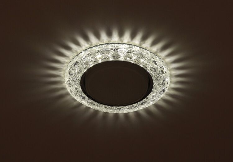 Светильник точечный встраиваемый с декоративной светодиодной подсветкой, прозрачный, GX53, 15 Вт предназначен для установки в потолочные или стеновые конструкции там, где нужен фокусированный свет без лишней яркости. Подходит для подсветки картин, зон ниш, молдингов, архитектурных элементов и декора. Часто используется в гостиных, спальнях, холлах, ресторанах и торговых залах. Не рекомендован для ванных комнат, кухонь с высокой влажностью или на улице.