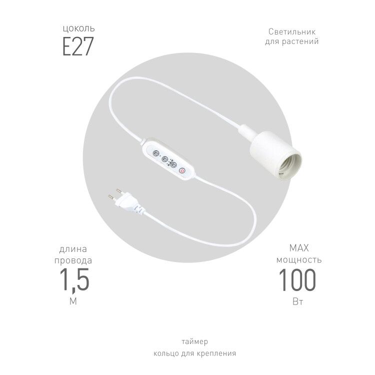Светильник для растений с цоколем E27, с проводом, с таймером совместим со всеми лампами, имеющими цоколь E27. Для монтажа достаточно вкрутить выбранную фитолампу в патрон и зафиксировать светильник на опоре - например, на крюке, перекладине или специальном креплении. Провод длиной 1,5 м позволяет размещать устройство на расстоянии до полутора метров от розетки. Крепление не требуется - вес компактен, и светильник можно просто повесить на крюк или подвесить на кабель. Напряжение питания - 220 В, частота 50 Гц.