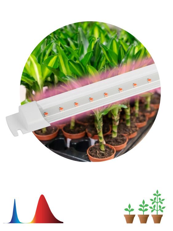 Светильник светодиодный для растений линейный FITO-10W-Т5-RB-Slim 10 Вт Т5 красно-синего спектра создан специально для фотосинтеза. Он заменяет естественное солнечное освещение там, где его недостаточно - в зимний период, в закрытых помещениях или при плотном расположении растений. Подходит для выращивания рассады томатов, перцев, зелени, цветов и других культур. Активирует фазу цветения у взрослых растений за счёт оптимального соотношения красного и синего света.