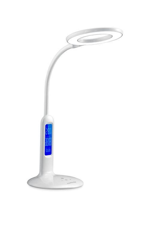 Светильник светодиодный 8Вт 500лм 230В с сенсором, термометром, регулировкой яркости и цветов, белый предназначен для местного освещения в помещениях с постоянным пребыванием людей. Подходит для домашних офисов, кабинетов, спален, детских комнат и зон отдыха. Интегрированные функции - термометр, часы, календарь и будильник - делают его удобной альтернативой отдельным устройствам.