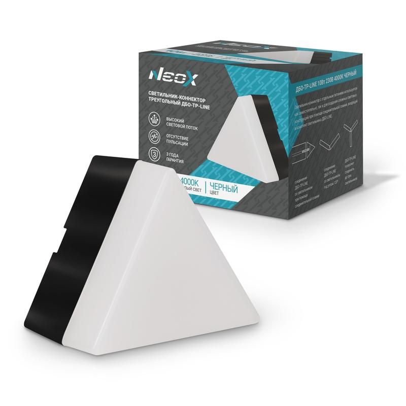 Светильник-коннектор ДБО-ТР-LINE 10 ватт 4000 кельвин 1000 люмен 230 вольт треугольный черный от бренда NEOX (артикул 4690612039688) предназначен для создания гибких световых контуров и фигур в интерьере, одновременно выполняя функцию соединения между основными светильниками серии ДБО-Line.