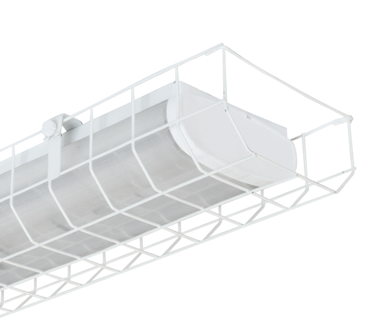 Основание светильника выполнено из стали и окрашено белой порошковой краской, что придает ему прочность и долговечность. Рассеиватель изготовлен из прозрачного экструдированного полистирола, который обладает высокой устойчивостью к ультрафиолетовым лучам. Торцевые крышки светильника изготовлены из ударопрочного полистирола и прикреплены к основанию с помощью пружин. Светильник также оснащен защитной сеткой с шестью ребрами жесткости из стали.