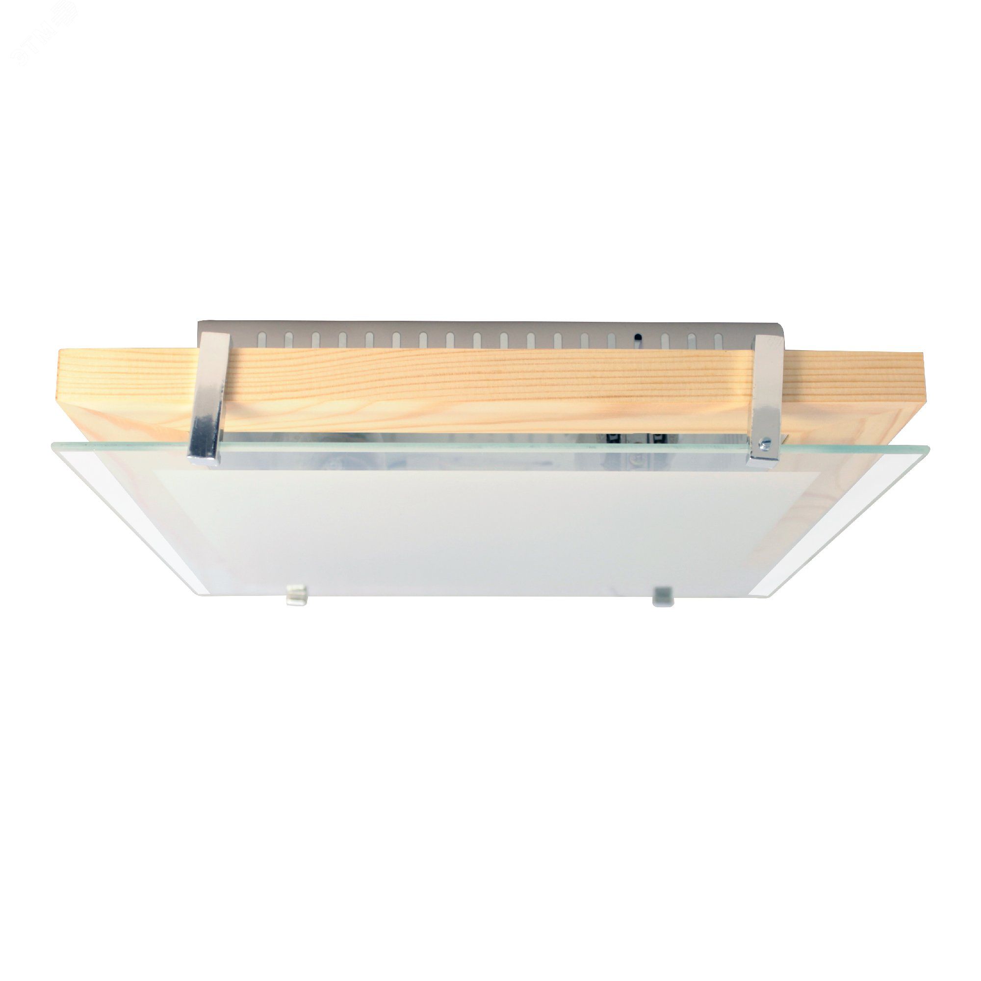 Светильник 300х300 НПБ 09-2х40-001 М94 белый корпус сосна держатель хром ИУ - это настенно-потолочный светильник из серии Полесье с деревянной фактурой корпуса и хромированными деталями, предназначенный для равномерного внутреннего освещения жилых и общественных помещений. Устройство работает с двумя LED-лампами по 40 Вт, имеет класс защиты I и степень IP20, что делает его подходящим для сухих интерьеров.