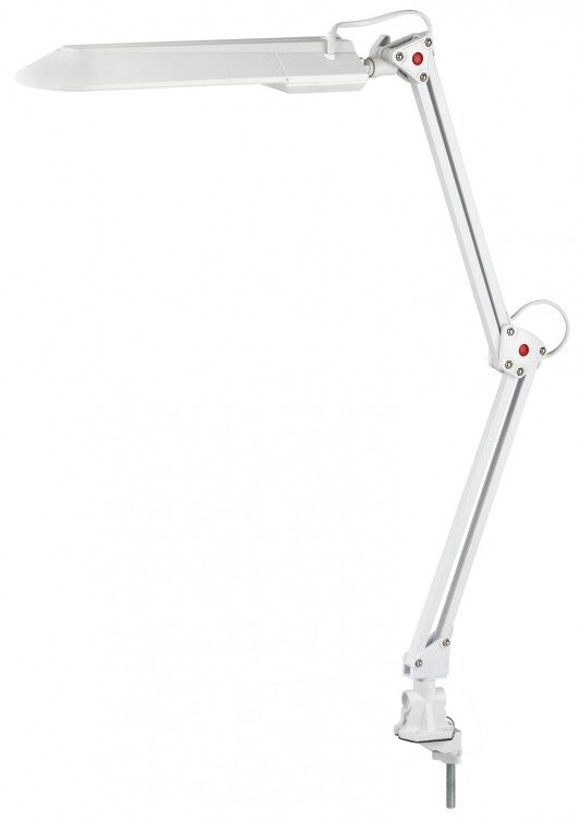 Светильник настольный с лампой PL на струбцине 11 Вт, тип цоколя G23, белый крепится через винтовое зажимное устройство - струбцина фиксируется на столешницу толщиной до 50 мм. Нельзя использовать на круглых, неровных или слишком тонких поверхностях. Монтаж занимает менее минуты: достаточно раскрыть струбцину, закрепить её и включить питание. Регулировка высоты осуществляется двумя сегментами стойки, а угол светового потока меняется поворотом плафона в любую сторону. Лампу заменить невозможно - она запаяна в корпус, поэтому весь светильник следует менять при выходе из строя.
