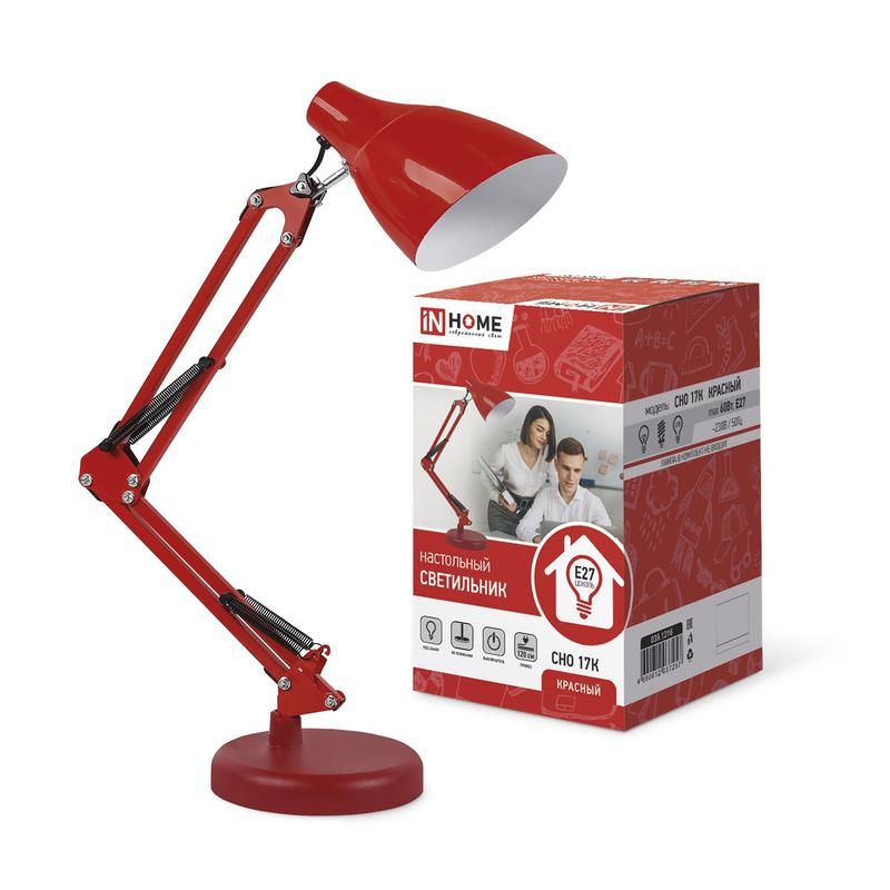 Настольный светильник СНО 17К красный от IN HOME с артикулом 4690612037257 предназначен для точечного освещения рабочих зон - идеально подходит для чтения, учёбы или работы за столом. Он совместим с лампами до 60 Вт, имеет регулируемый шарнир и питается от сети 230 В. Лампа в комплект не входит.
