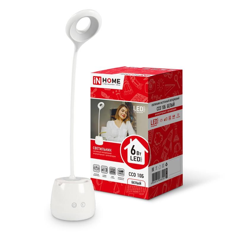 Светильник светодиодный настольный ССО 10Б 6Вт 6500К 480лм аккум. сенсор-диммер с органайзером USB-кабель бел. IN HOME 4690612036595