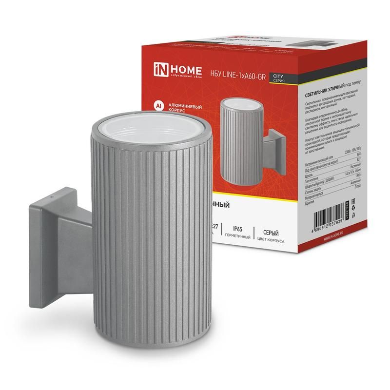 Светильник уличный односторонний НБУ LINE-1хA60-GR алюминиевый под лампу 1хA60 E27 230В серый серии CITY IP65 - это настенный светильник из алюминия с защитой IP65, предназначенный для фасадного освещения зданий. Подходит для установки стандартных LED-ламп с цоколем E27. Модель выпускается брендом IN HOME в сером исполнении и рассчитана на работу в условиях улицы при температурах от -20 C.