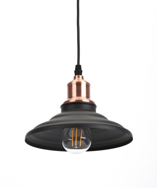 Светильник подвесной декоративный металл, E27, max 60W, d203 мм, шагрень черный/медь предназначен для внутреннего освещения жилых и коммерческих помещений. Его используют там, где важна атмосфера, а не максимальная яркость: над обеденными столами, в столовых, на кухнях, в коридорах, кафе и офисах. Подходит для установки в сухих помещениях с нормальной влажностью. Не применяется во влажных зонах (ванная, баня) или на улице.