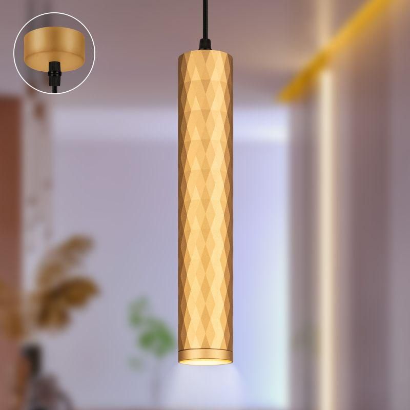 Светильник подвесной потолочный PL15 GD MR16 GU10 цилиндр золото предназначен для точечного освещения интерьеров жилых и коммерческих помещений: гостиных, холлов, ресторанов, бутиков и выставочных зон. Благодаря минималистичному цилиндрическому формату и золотому покрытию с рельефом «ромб» он служит не только источником света, но и элементом дизайна. Установка возможна как на потолок, так и на подвесной кронштейн - позволяет регулировать высоту до 1,5 метра.